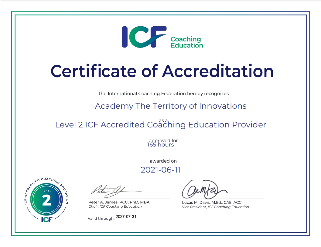 Программа аккредитована ICF (International Coaching Federation), крупнейшей федерацией коучинга в мире.